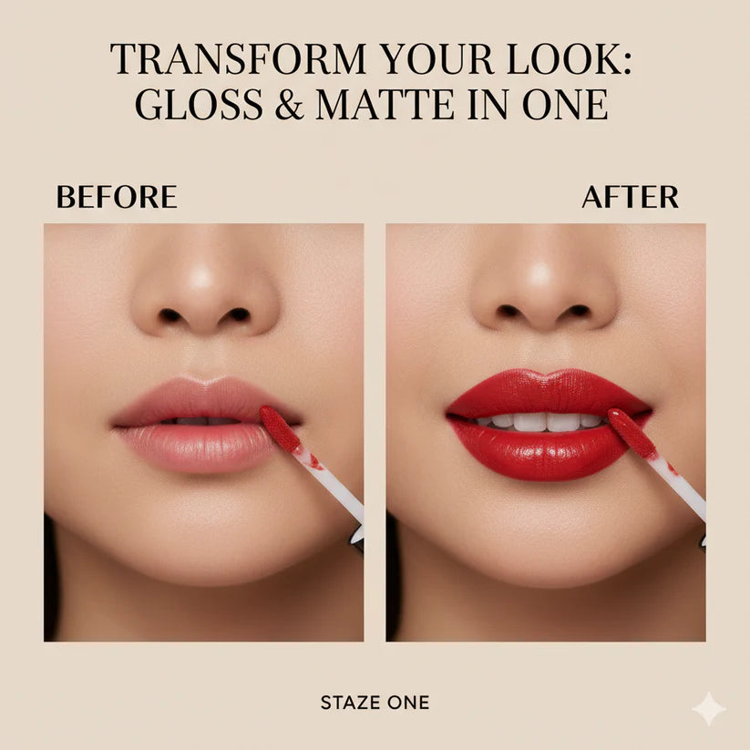 Indulge your lips in a two-some with Staze 9to9 Gloss Lock 2-in-1 Liquid Lipstick. This two-tally powerful duo serves 12 hours unstoppable lip glam from first coffee runs to final cocktail hours. With its Non-Sticky Gloss and Color-Locking Lipstick, it boasts Transfer-Resistant wear so nothing comes between your kiss, toasts, and delicious bites. Available in 6 show-stopping shades, it is designed to suit all Indian skin tones & invite compliments all-day.